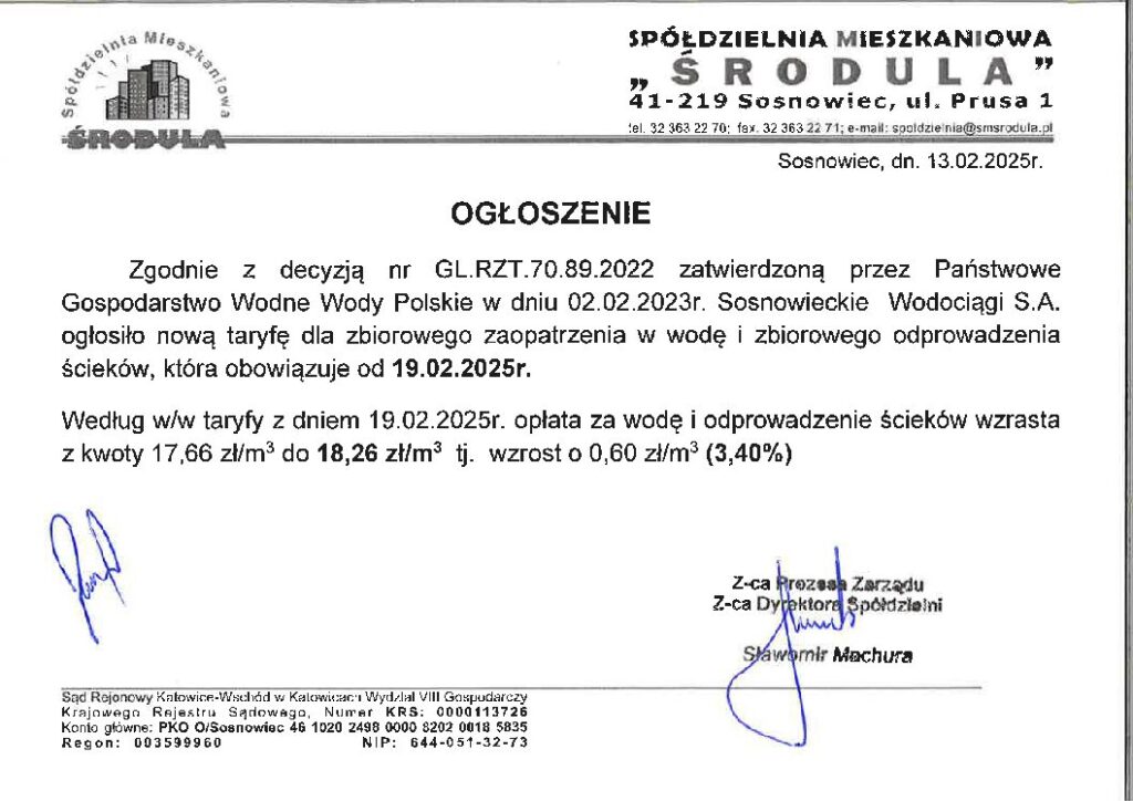 OGŁOSZENIE DOTYCZĄCE ZMIAN CEN WODY