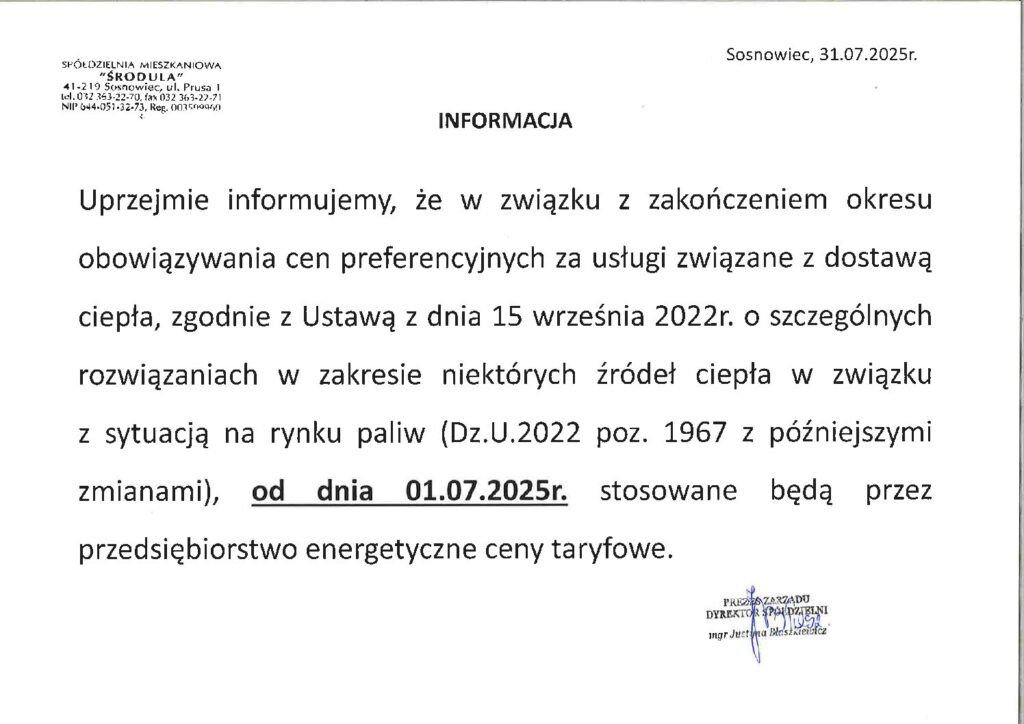 INFORMACJA DOTYCZĄCA CEN ZA USŁUGI ZWIĄZANE Z DOSTAWĄ CIEPŁA