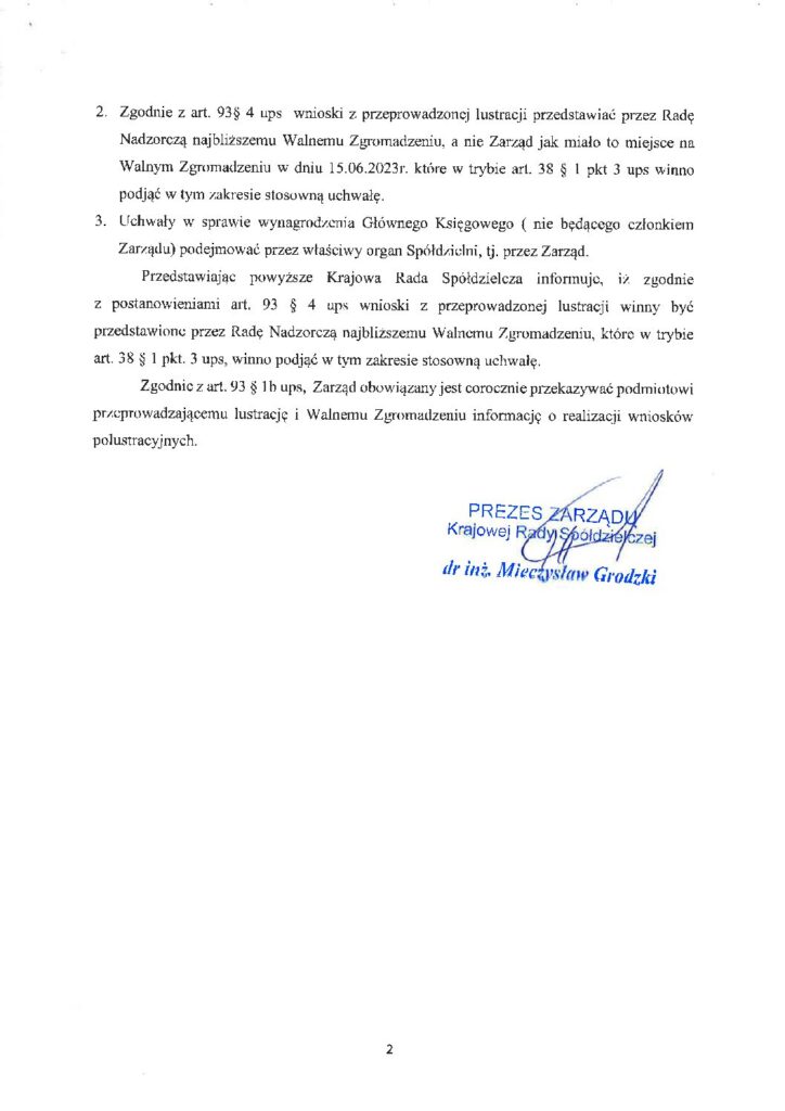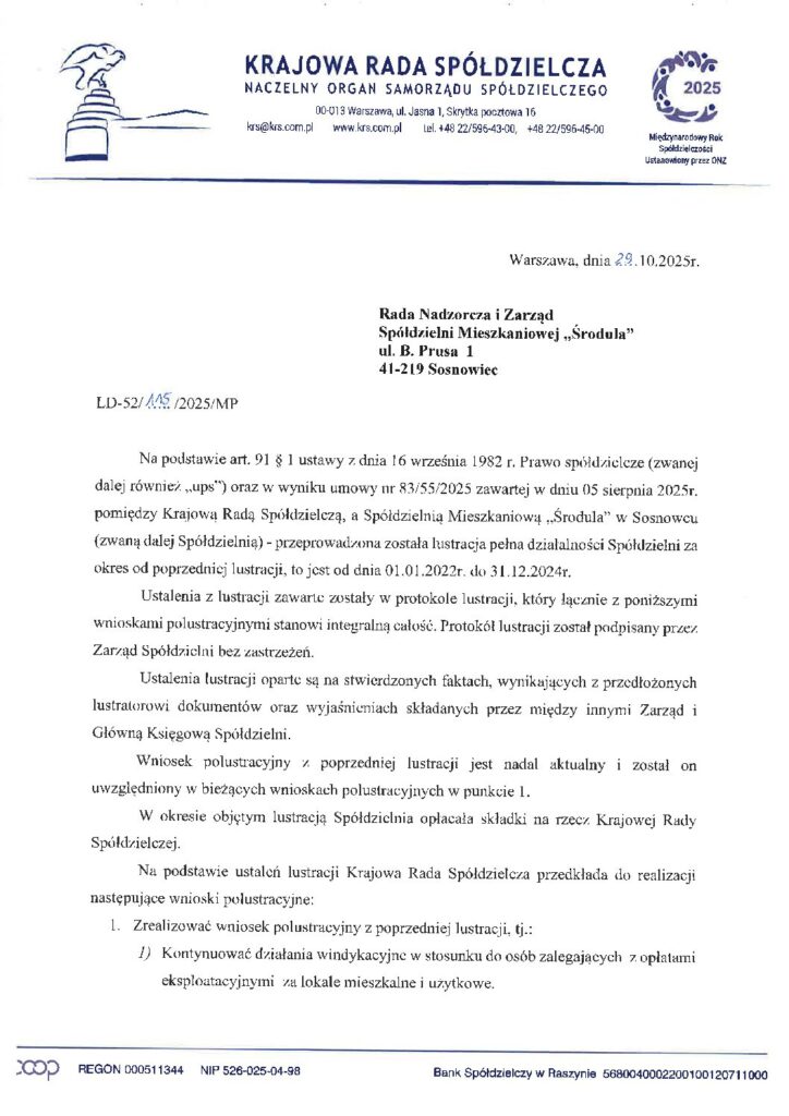 N a podstawie art. 91 § 1 ustawy z dnia 16 września 1982 r. Prawo spółdzielcze (zwanej dalej również „ups”) oraz w wyniku umowy nr 90/49/2022 zawartej w dniu 08.09.2022 r. pomiędzy Krajową Radą Spółdzielczą, a Spółdzielnią Mieszkaniową „Środula” (zwaną dalej Spółdzielnią) – przeprowadzona została lustracja pełna działalności Spółdzielni za okres od poprzedniej lustracji, to jest od dnia 01.01.2022 r. do 31.12.2024 r.