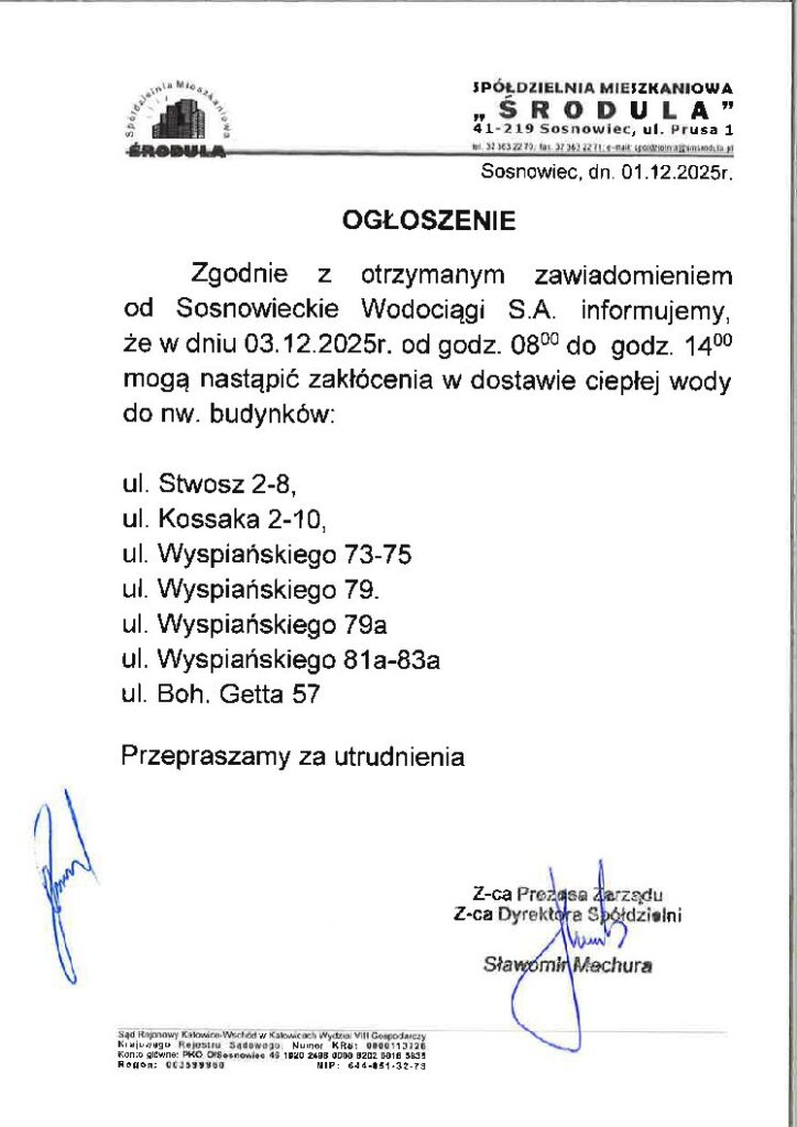 ZAKŁÓCENIA W DOSTAWIE CIEPŁEJ WODY W DNIU 03.12.2025r.