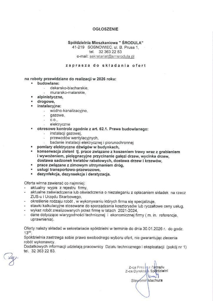 OGŁOSZENIE DOTYCZĄCE SKŁADANIA OFERT NA ROBOTY PRZEWIDZIANE DO REALIZACJI W 2026R.