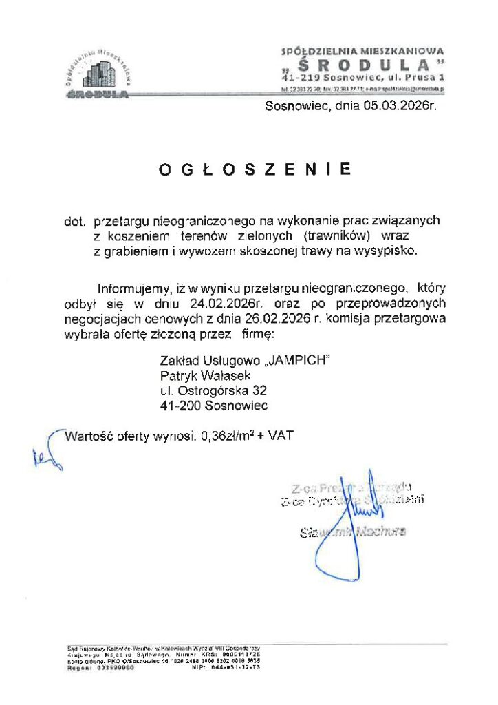 OGŁOSZENIE DOTYCZĄCE WYNIKU PRZETARGU NA WYKONANIE KOSZENIA TERENÓW ZIELONYCH