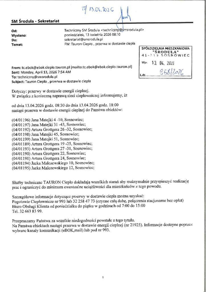 PRZERWA W DOSTWIE CIEPŁA W DNIU 13.04.2026r.
